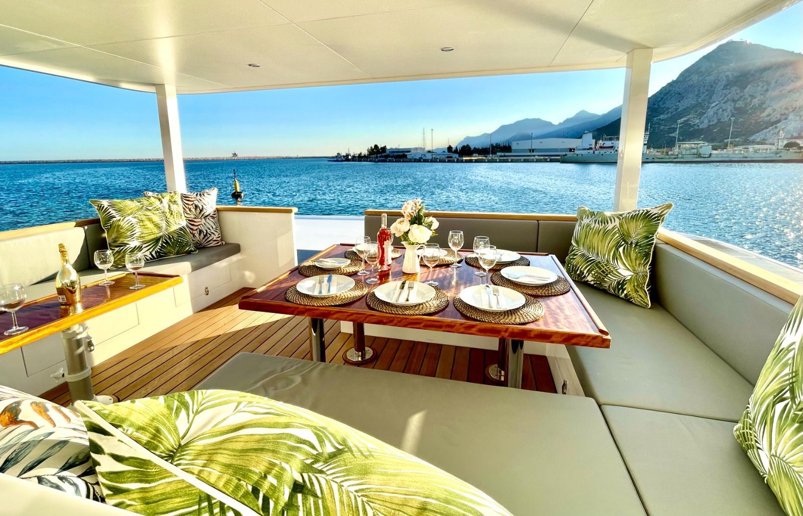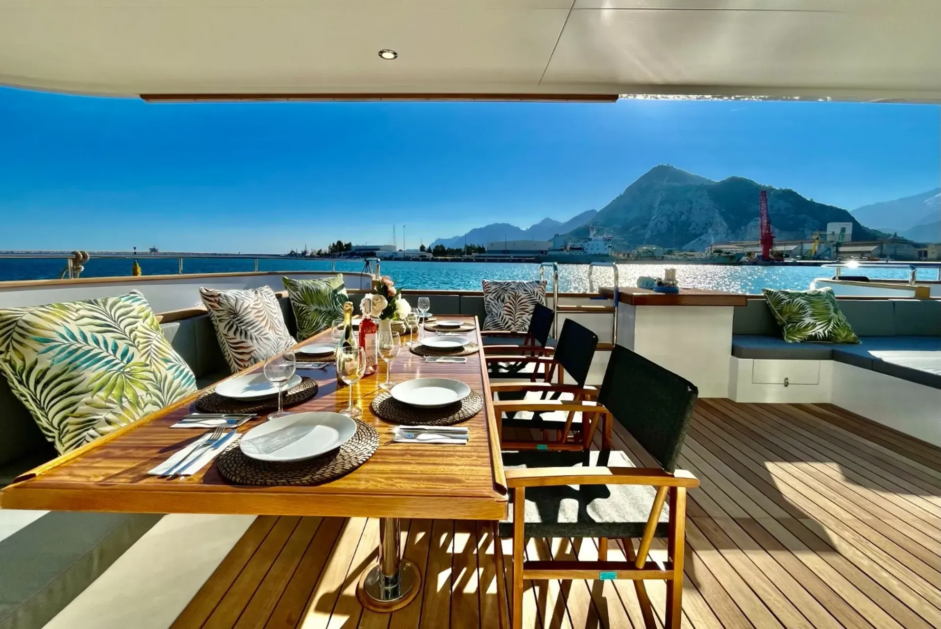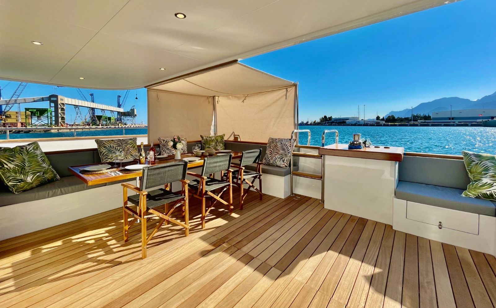 The interior features a spacious salon with a cozy dining area and stylish lounge. The outdoor areas are equally well equipped: an inviting dining area, large sofas, and sunbeds that encourage guests to linger. On the flybridge, you'll find a shaded area with a hardtop bimini, wet bar, lounge furniture, and an additional dining area – the perfect place for social gatherings or relaxed sun-soaked moments.