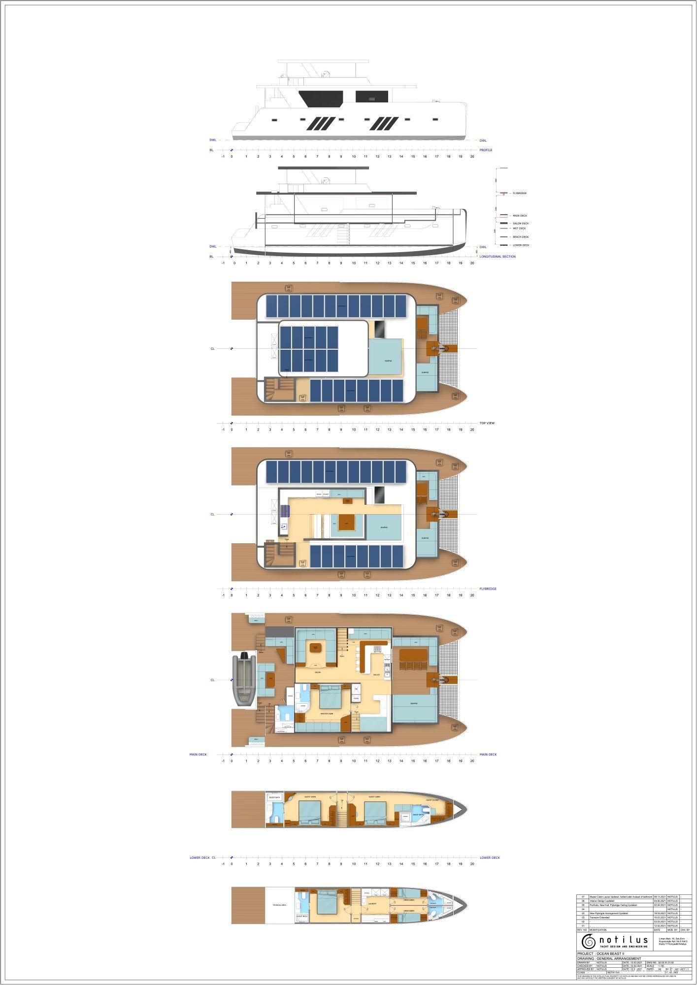 This motor catamaran has a cruising speed of about 8 knots and consumes approximately 20 liters per hour, giving it an impressive range.